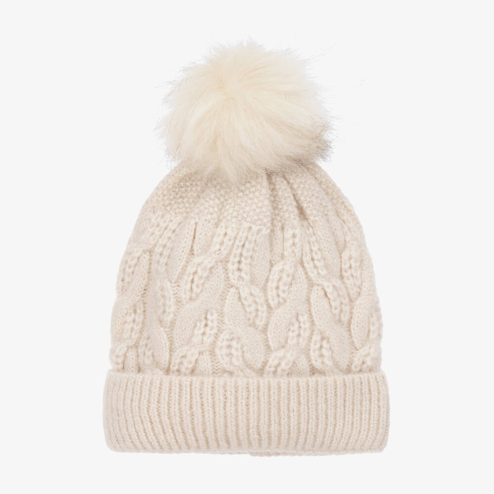 Ivory cable-knit pom-pom hat for girls by Spanish brand Mayoral, with a glittery silver fleck running through the weave. Super soft and cosy, it has a large, faux fur pom-pom on top and a ribbed, upturned brim.
