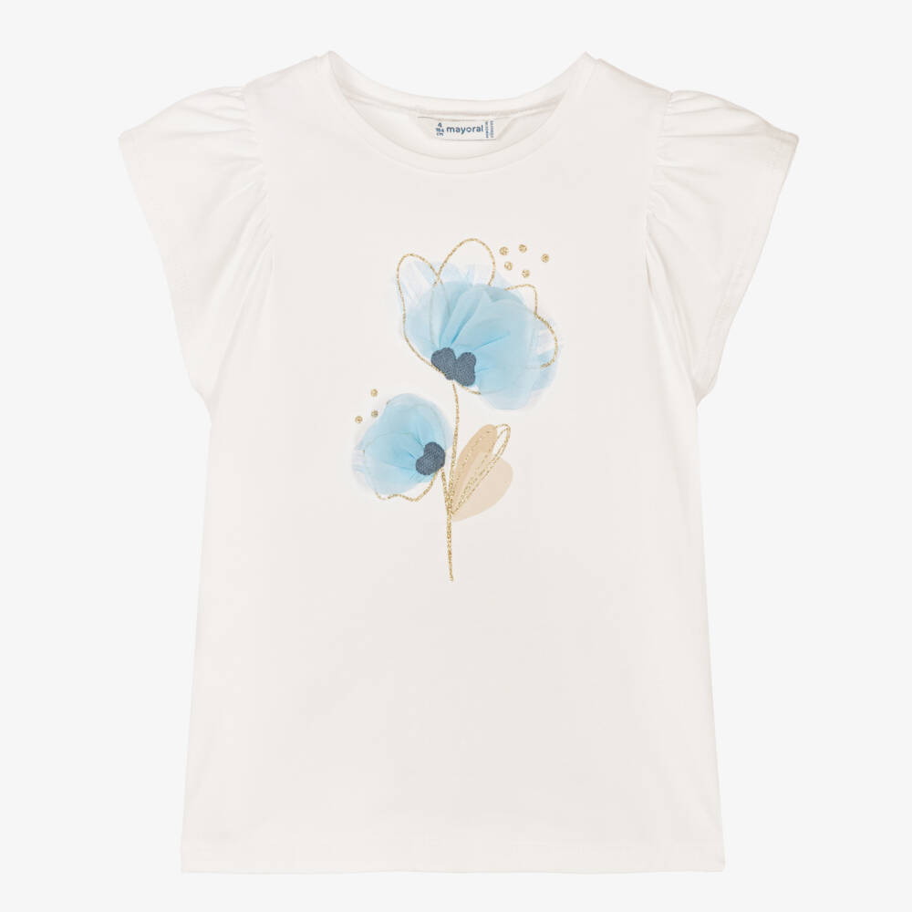 Girls pretty ivory T-shirt by Mayoral made in comfortable cotton jersey. The appliquéd blue flowers and shimmering gold details give a special touch to this casual top.