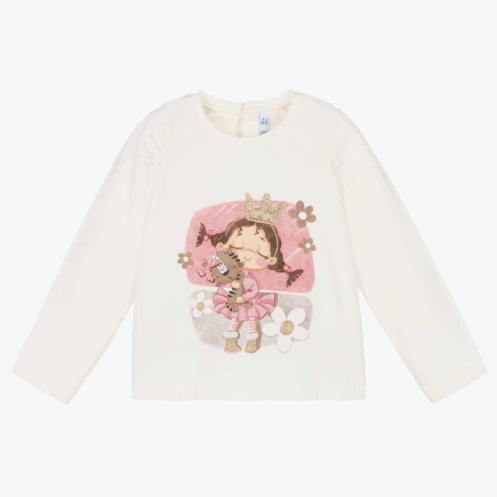 An ivory top for younger girls by Mayoral, made in soft, sustainable cotton jersey. A sweet design in pink and beige, printed on the front is a little girl hugging a friendly cat, with gold glitter accents, florals and a crown appliqué on top of her head. The raglan sleeves are slightly gathered on the shoulders and the top fastens with easy-to-use poppers on the back.