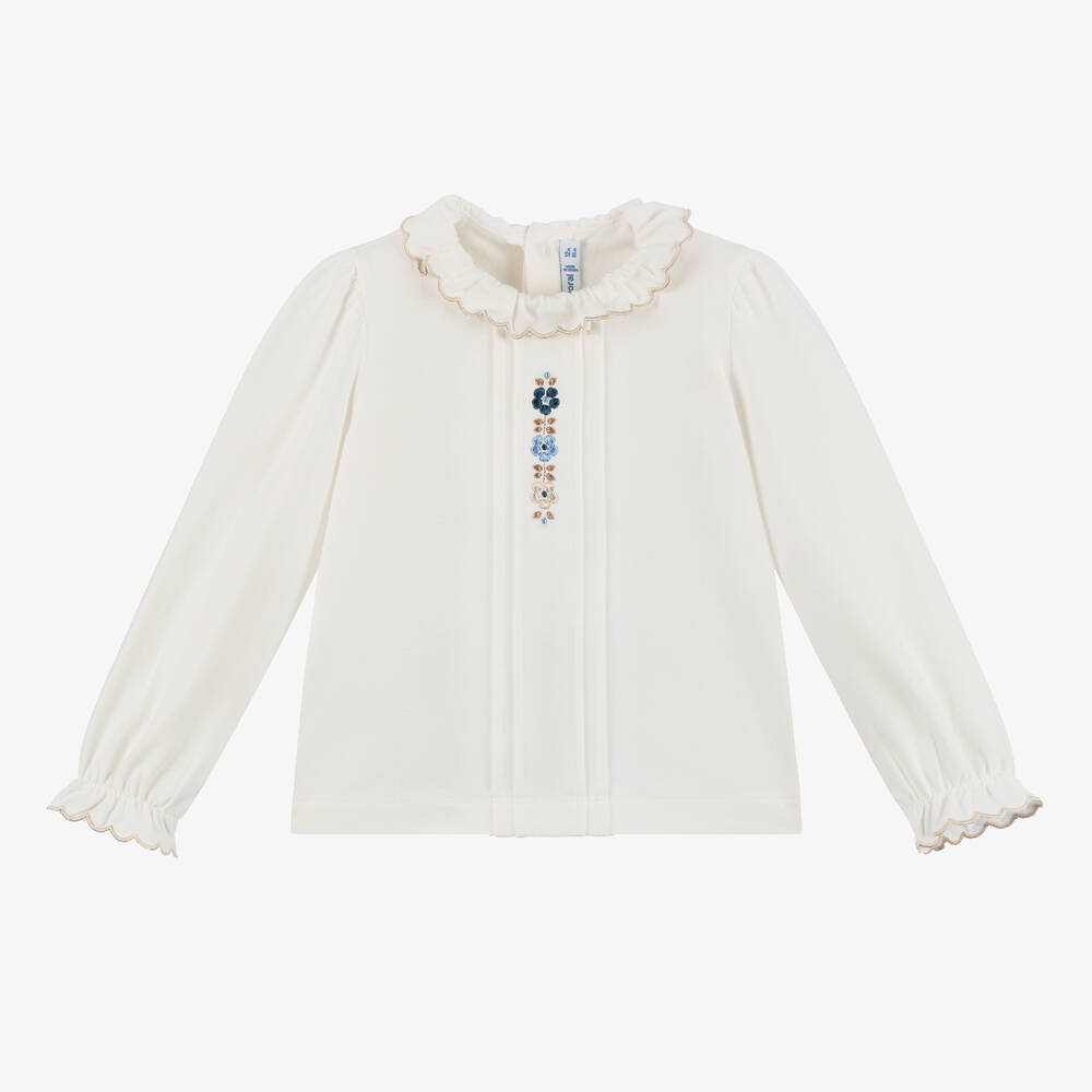 A delightful ivory top for little girls by Mayoral, made from super soft cotton jersey. Beautifully embroidered on the front pleated panel are blue and beige flowers for added charm. Fastening with concealed poppers on the back, it has pretty scalloped edges on the frilled collar and the stretchy fluted cuffs for a sweet finish.