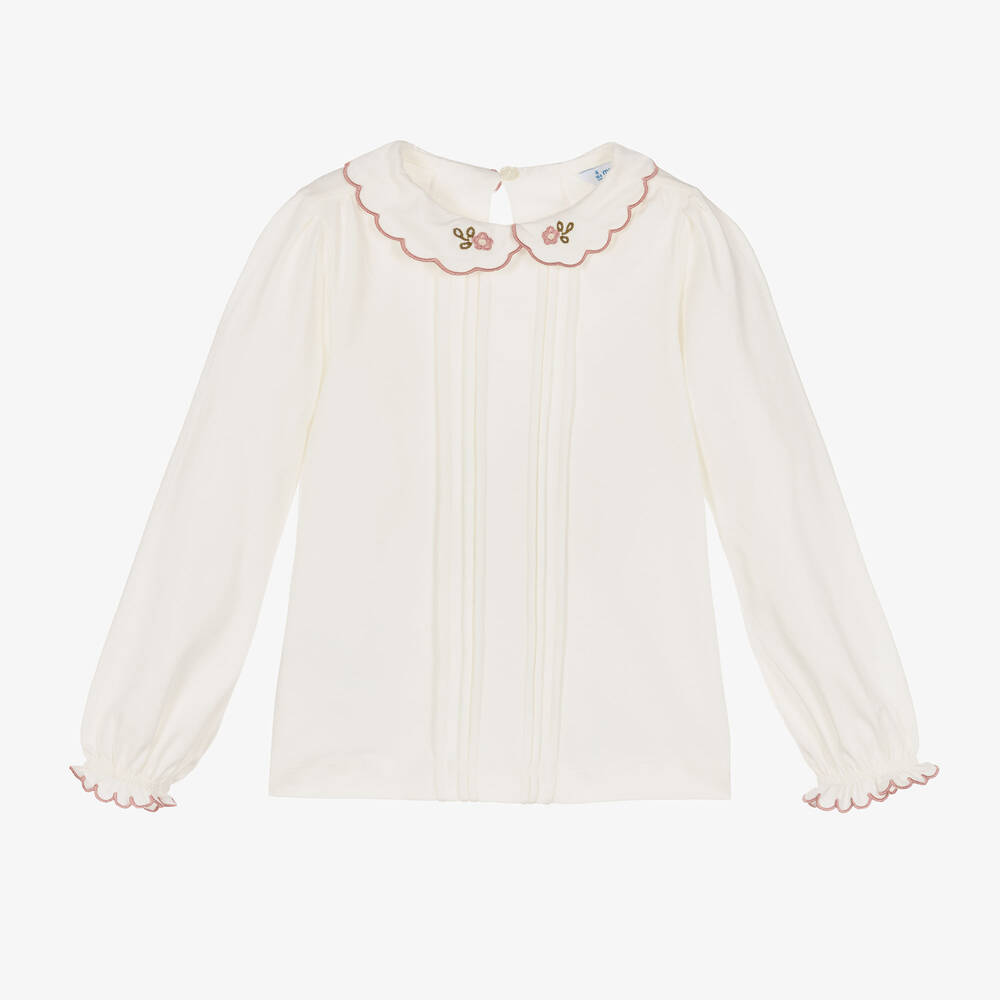 Ivory blouse for girls by Mayoral, made in soft and comfortable cotton jersey with a brushed feel. It has a sweet scalloped collar trimmed with pink edging and pretty pink and green floral embroidery. There are neat pintucks on the front and gently puffed long sleeves with elasticated cuffs and matching pink scalloped edging. It fastens neatly on the back with a single button.
