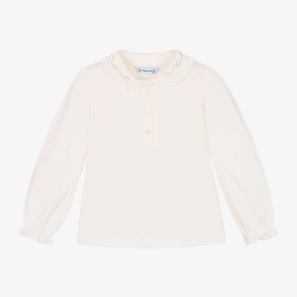Ivory cotton polo top for younger girls by Mayoral, with classic front button fastenings in shimmering ivory. Super comfortable, it is made in soft and stretchy jersey, with a smart collar embroidered with golden hearts and softly elasticated long-sleeve cuffs.