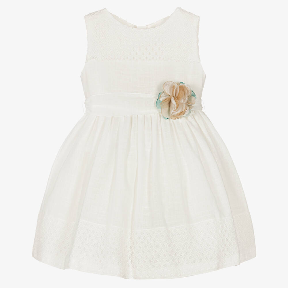Elegant for special occasions, an ivory dress for girls by Mayoral, with delicate guipure lace trims. Made and lined in a sheer and lightweight cotton blend, it has a netting trim around the lining for a beautifully shaped hemline. The removable sash, with a fixed beige and green fabric flower, gives it a lovely finishing touch.