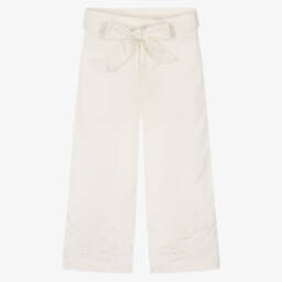 Girls ivory wide-leg trousers by Mayoral, with a pretty floral embroidery on the front of each leg. Cool and comfortable, they are made in a lightweight cotton and linen blend with a partial lining for comfort. Fastening with a zip and button, they have an adjustable waistband for a great fit and finished a removable tie belt.