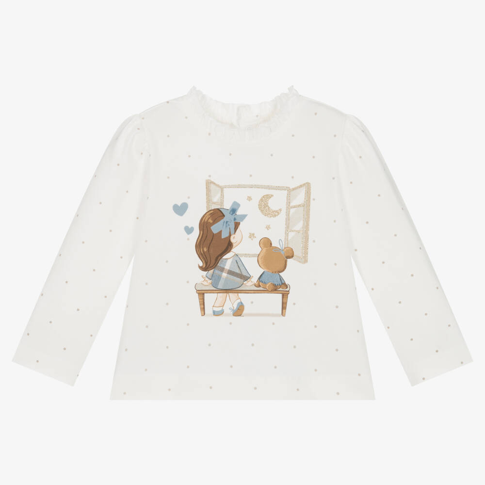 Absolutely adorable, this ivory long-sleeved top for little girls by Mayoral is made from soft cotton jersey. Printed on the chest is a cute girl with her teddy bear, gazing out of the window at the sparkly moon and stars. Patterned with light beige polka dots, this top has a pretty frill at the neckline, subtly puffed sleeves, and practical popper fastenings on the back.