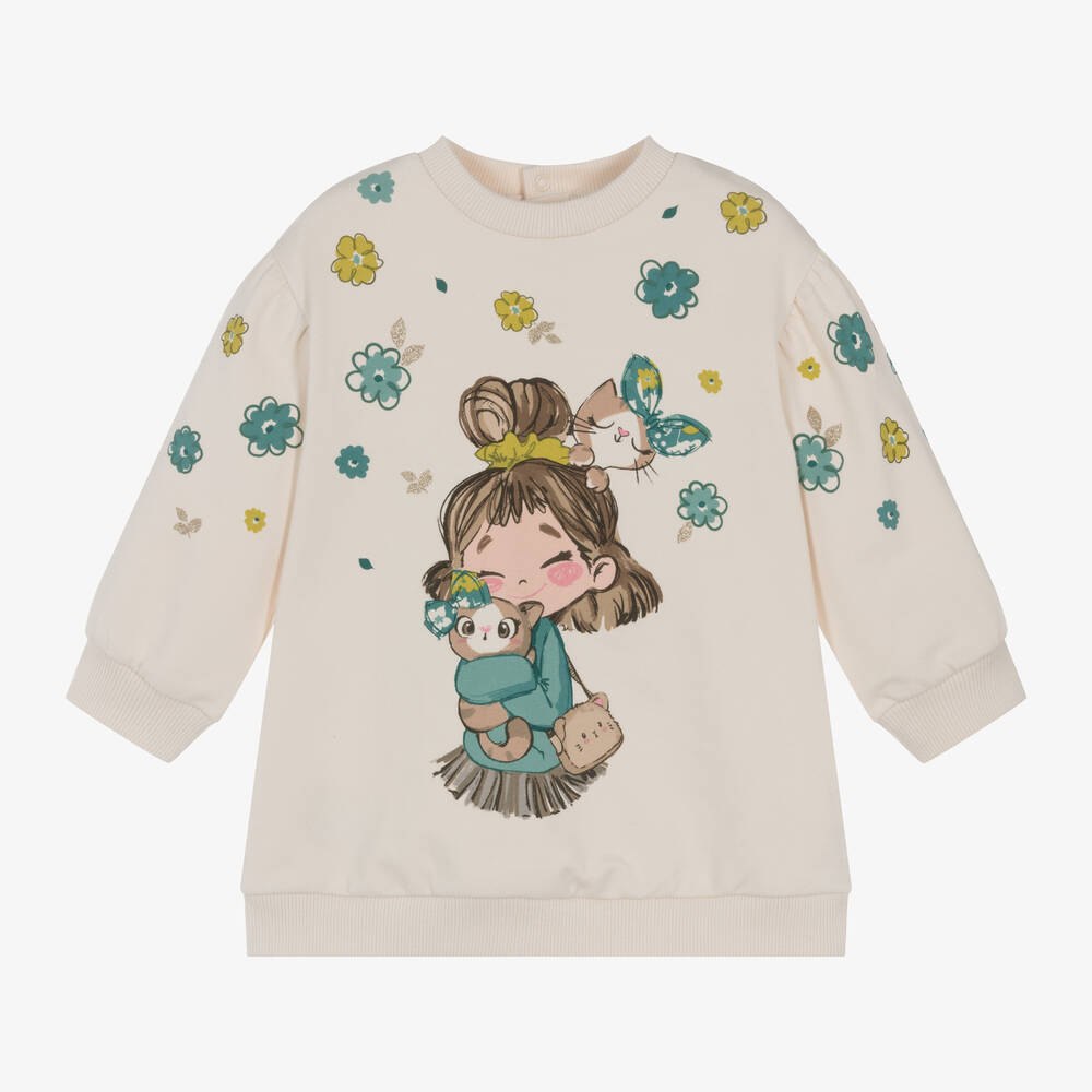 A lovely ivory sweatshirt dress for little girls by Mayoral, made from a soft mid-weight cotton jersey with a fleecy interior. It is printed with a cute 'girl cuddling her cats' design on the front, surrounded with green flowers and gold glitter accents for added sparkle. Casually styled, it has dropped shoulder long sleeves, ribbed trims, and popper fastenings on the back.