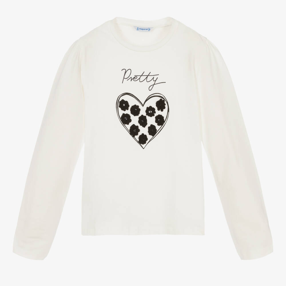 Ivory top for girls by Mayoral, made in soft and comfortable cotton jersey. It has a black heart design on the front, decorated with appliqué flowers and the word 'pretty' printed above.