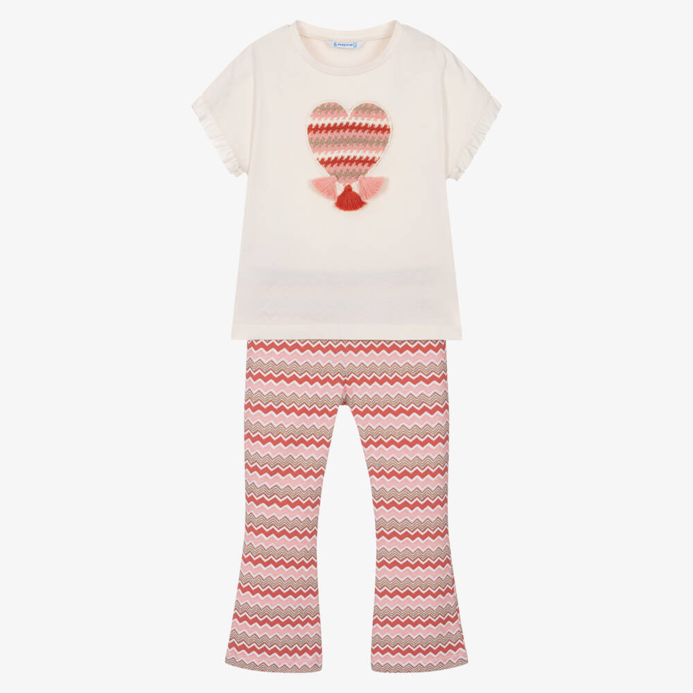 Ivory and pink leggings set for girls by Mayoral, made in soft cotton jersey. The top has short sleeves with pretty ruffle trims and a large crocheted heart on the front in shades of pink, beige and ivory, with fun tassel trims. The leggings are gently flared and have a cool zigzag pattern with an elasticated waist for a comfortable fit.