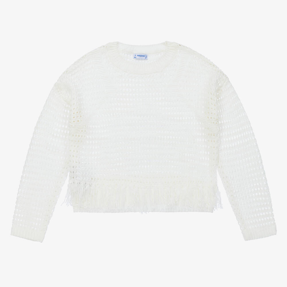 An ivory sweater for girls by Mayoral. A great layering piece, this soft jumper is made in open-work crochet, with fringing along the hemline for a cool boho look.