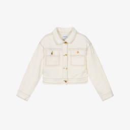 Girls ivory wide leg jeans by Mayoral, with contrasting beige overstitching. Made in soft denim, these jeans have an adjustable waistband for a great fit, with pleats below and frayed hems for a touch of casual flair for a relaxed look.