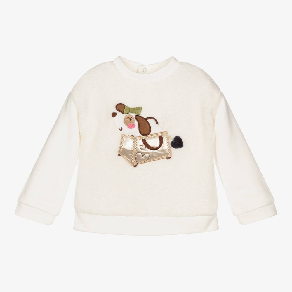Cute ivory top for younger girls by Mayoral, made in a mid-weight, cotton blend velour. It has a soft, lined, bouclé front with a central dog appliqué, wearing a green bow and sitting in a shiny gold faux leather bag.