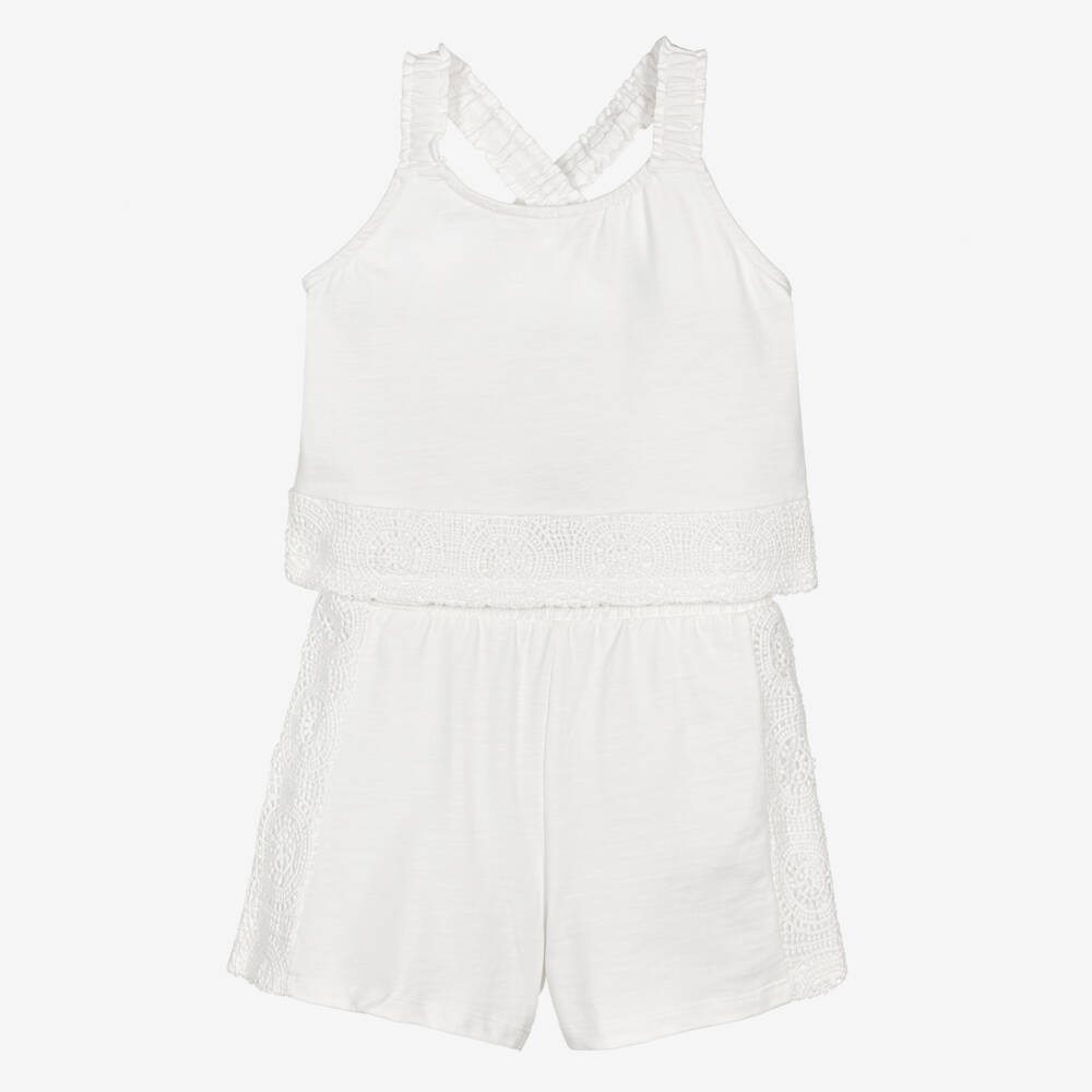 An ivory shorts set for older girls by Spanish brand Mayoral, made in soft cotton jersey. For contemporary styling, both pieces are trimmed in an embroidered abstract design. The top has stretchy straps that cross over on the back, while the shorts have a comfortable elasticated waistband.