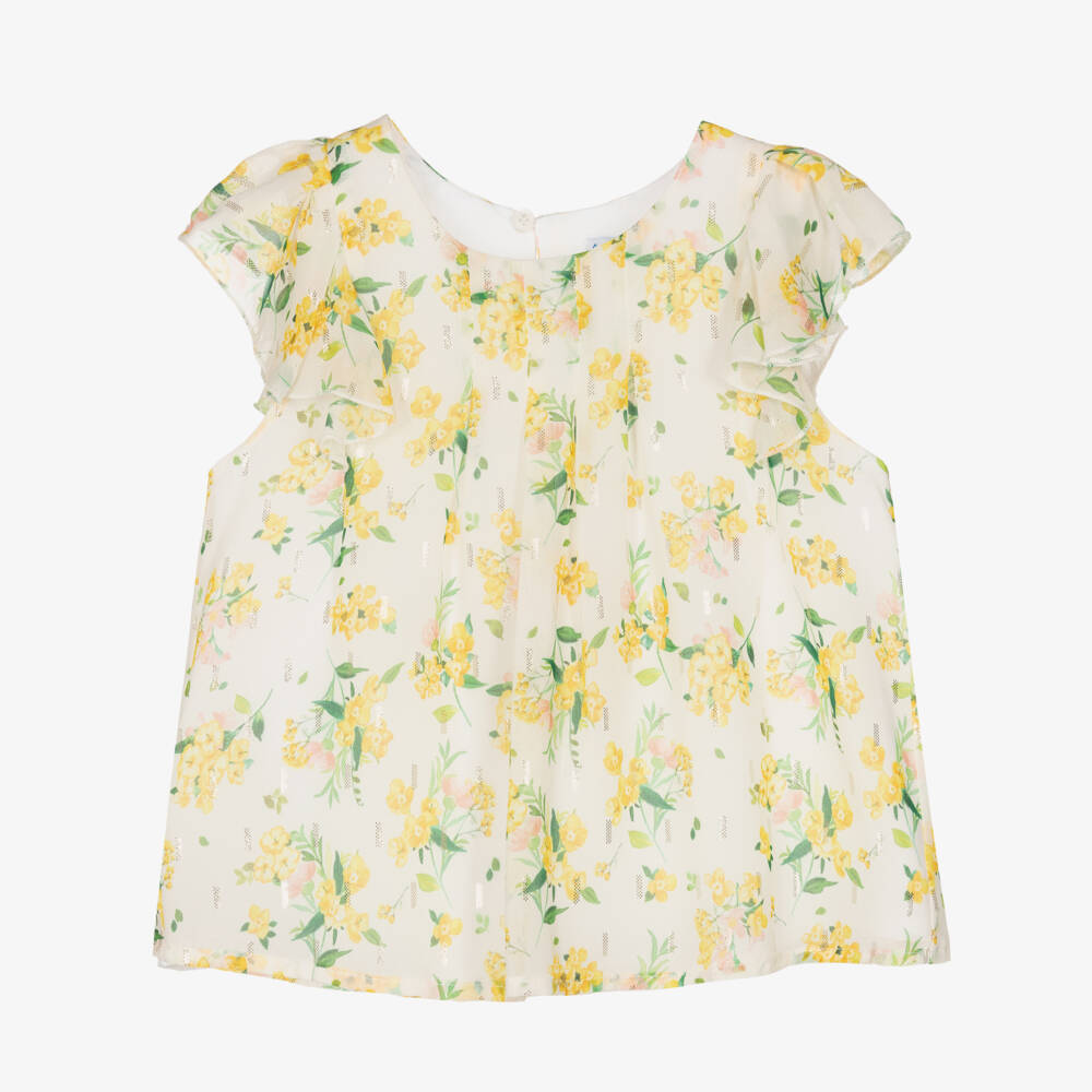 Girls lovely ivory crêpe chiffon blouse by Mayoral, in a yellow, pink and green floral print with a subtle gold pattern for a little sparkle. Sheer and lightweight, it has soft pleated detail on the front and pretty ruffles over both shoulders. It is fully lined for comfort and there is a button fastening on the back for ease of dressing.