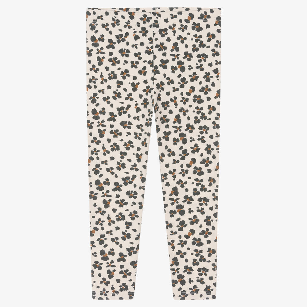 Dark ivory leggings for girls by Mayoral, with a black and brown floral pattern. This easy-to-wear casual style is made in soft and stretchy sustainable cotton jersey with an elastic waist for a comfortable fit.