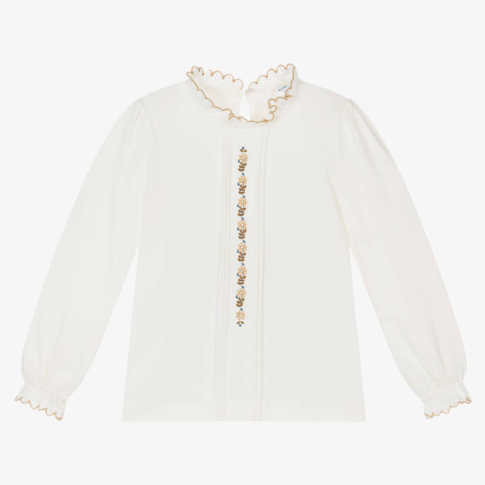 Lovely ivory long-sleeved top for girls by Mayoral, made in soft, comfortable, cotton jersey. The frilled neckline and elasticated cuffs have pretty scalloped gold trims, whilst the front has beautiful floral embroidery in brown and blue. The top has feminine, puffed sleeves and fastens on the back with a keyhole button fastening.