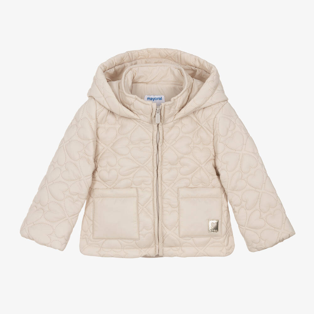 An ivory hooded jacket for little girls from Mayoral, quilted with a lovely heart pattern. Silky smooth and lightly padded, this practical zip-up style has a gently curved hemline and elasticated sleeve cuffs. There is a metallic gold, logo embossed faux leather patch on one of the front pockets.