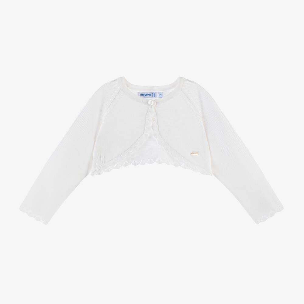 A charming finishing touch to her outfit, this sweet ivory bolero cardigan for little girls is from Mayoral. Knitted in a soft cotton and viscose blend, this long-sleeved style has pretty scalloped trim, a single button fastening and a gold logo plate on the front.