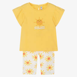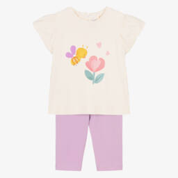 This ivory and lilac leggings set for little girls by Mayoral is both cheerful and comfortable. Made in soft cotton jersey, the T-shirt features a charming bee and floral motif on the front and a single button fastening on the back. It pairs beautifully with the lilac leggings, which have a comfortable elasticated waist.