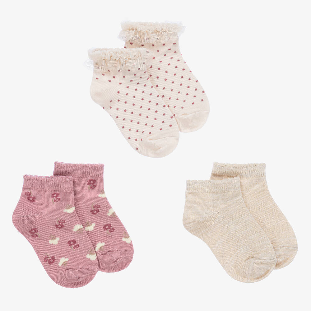 Pack of three pairs of ivory and pink ankle length socks for little girls by Mayoral. Made in a soft and stretchy blend of organic cotton they all have ribbed cuffs. One pair is plain ivory with metallic gold threads for a glittery finish, one pair is ivory with a pink spotted pattern and an ivory tulle ruffle around the cuffs. The pink pair have a sweet pink and ivory floral pattern.