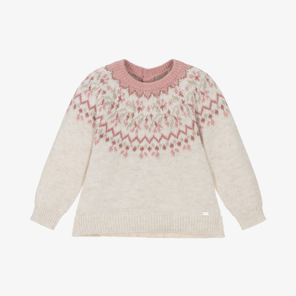 From Mayoral, an ivory knitted sweater for little girls. Made in a soft wool blend, this lovely sweater has a pink Fair Isle pattern on the top with specks of gold thread for a touch of sparkle. There are button fastenings on the back to help with dressing. This product contains recycled fibres.