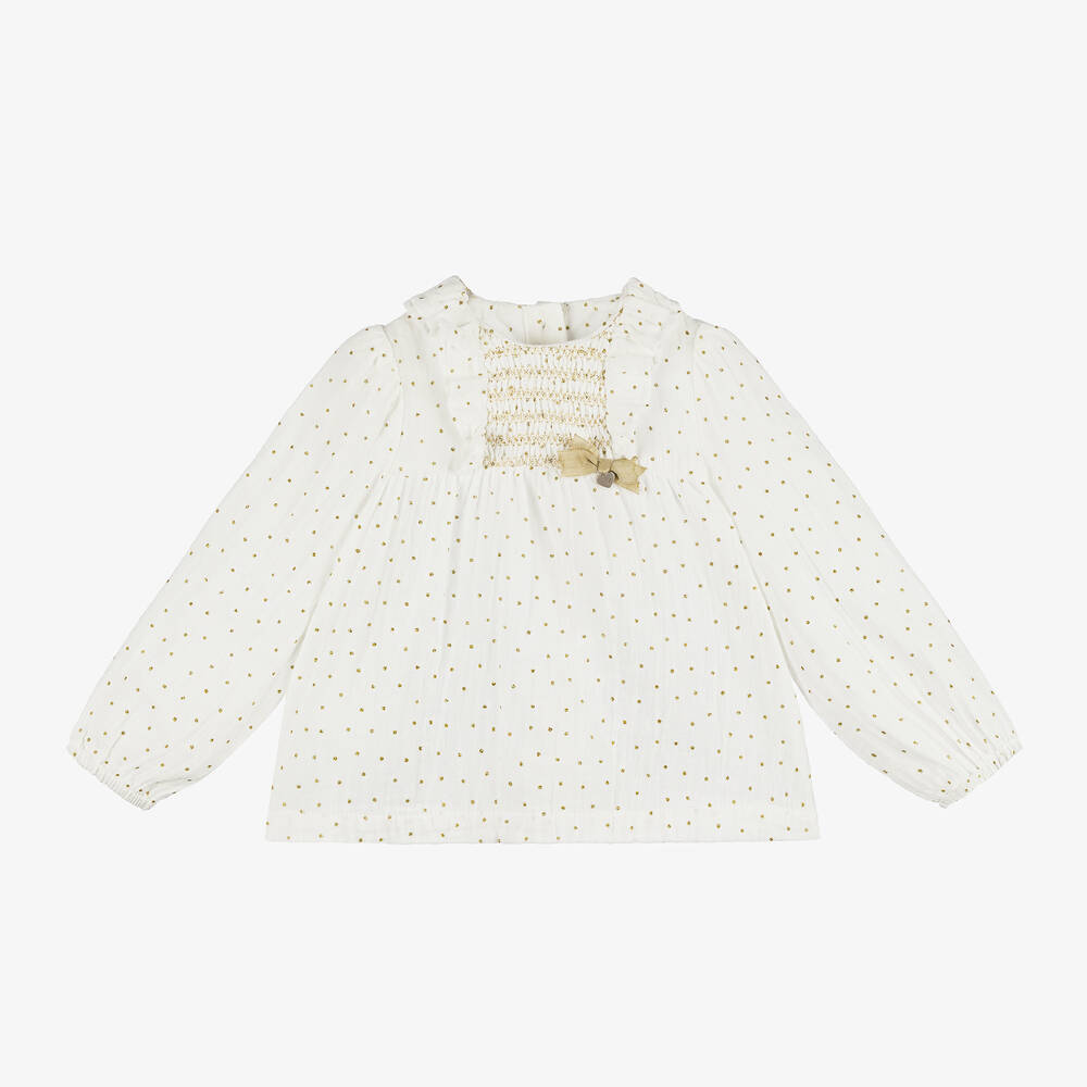 A lovely ivory top for little girls by Spanish brand Mayoral, made in soft and lightweight cotton muslin. Buttoned on the back, this sweet design is covered with metallic gold polka dots for a gentle shimmer. It has a shirred panel on the bodice with ruffled detailing and a delicate heart charm. The full-length sleeves are elasticated on the cuff for added comfort.