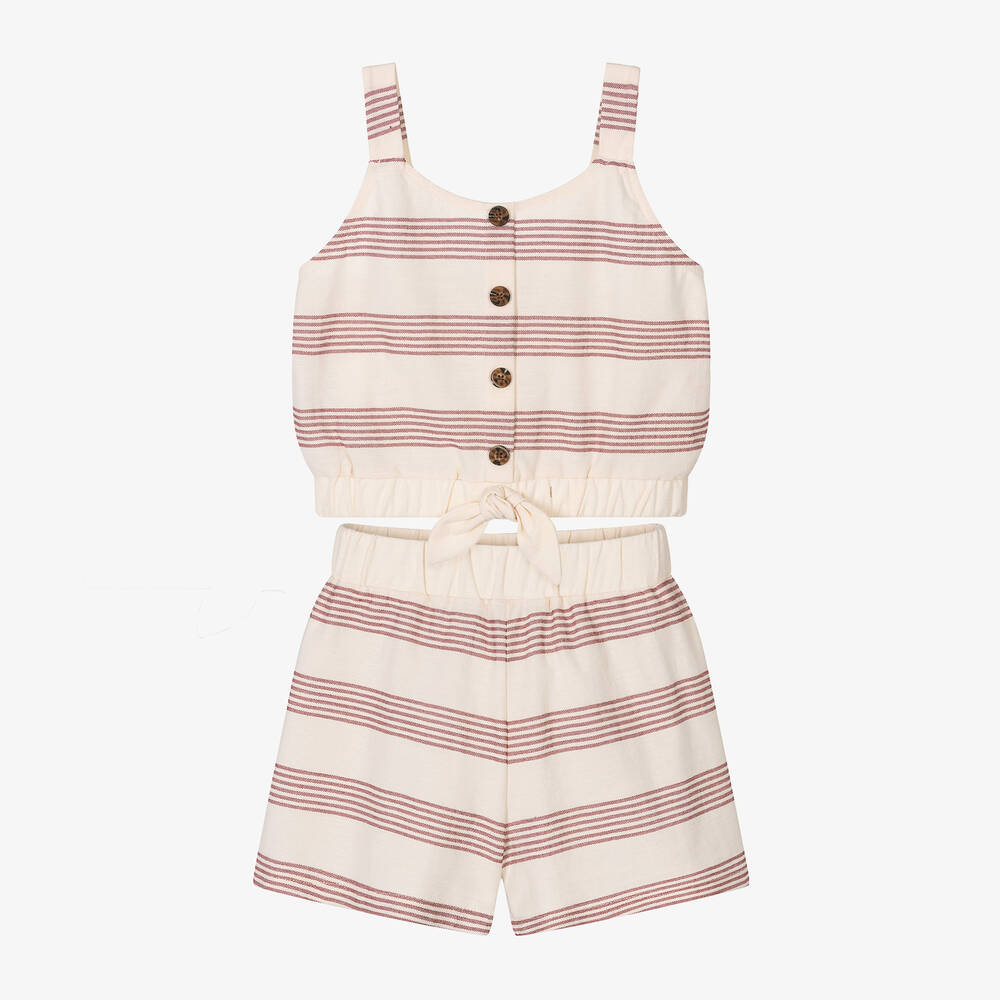A stylish dark ivory cotton blend shorts set for older girls by Mayoral, with a burgundy red striped design. Cool and casual, both pieces are made in lightweight jersey. The sleeveless top has decorative buttons on the front and an elasticated hem with a fixed bow. The matching shorts have an elasticated waistband for a comfortable fit.