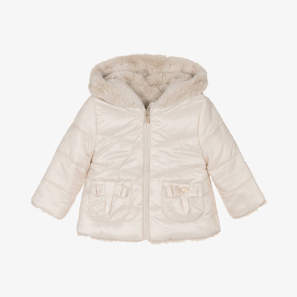 A lovely ivory coat for little girls by Mayoral, designed with a silky smooth exterior. Great for the cooler months, this hooded outerwear piece is fully reversible and padded for extra warmth. It has two small pockets on the front, one of which is branded with a gold heart charm. The other side is made from beautifully soft faux fur for an extra cosy feel when the temperature drops.
