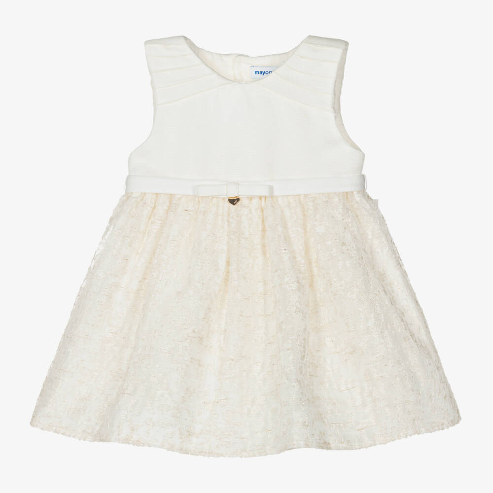 Lovely ivory sleeveless dress for little girls, by Mayoral. Woven in a soft linen blend, it has smart pleats on the shoulders and a bow sash belt with a cute gold heart logo charm. Lined in soft cotton for comfort and volume, the skirt has a gorgeous organza overlay with a crushed velvet sheen. It has a stylish cut-out on the back and fastens with a concealed zip and simple buttons.