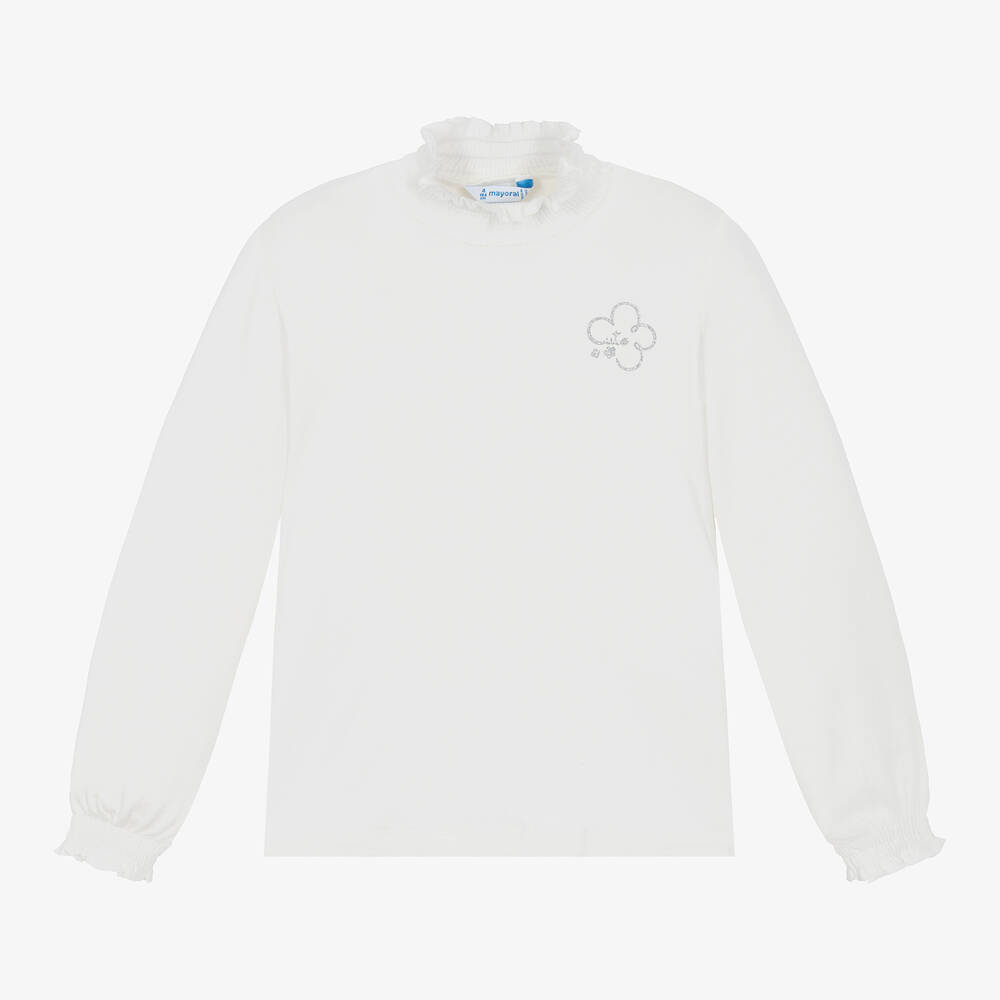 A lovely ivory top for girls by Spanish brand Mayoral, made in beautifully soft viscose jersey. It has a high, ruched neckline with a pretty frilled trim, with matching detailing on the cuffs of the long sleeves. A 'cute' flower design is printed in silver on the chest, adding a lovely touch of sparkle to this casual piece.