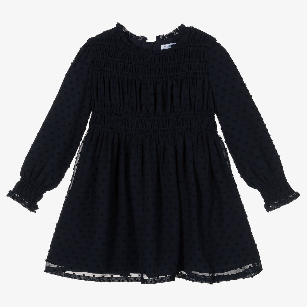 Navy blue dress for girls by Mayoral, made in soft plumeti chiffon. The bodice is decorated with shirring and has a concealed back zip fastening. It has a soft viscose voile lining and elasticated sleeve cuffs.