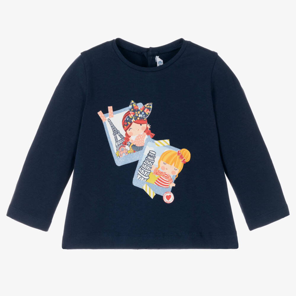 Cool and casual navy blue top for little girls by Mayoral, made in soft, stretchy jersey. This long-sleeved top has sweet colourful prints in the style of holiday photos on the front. Popper fastenings on the back make dressing quick and easy.
