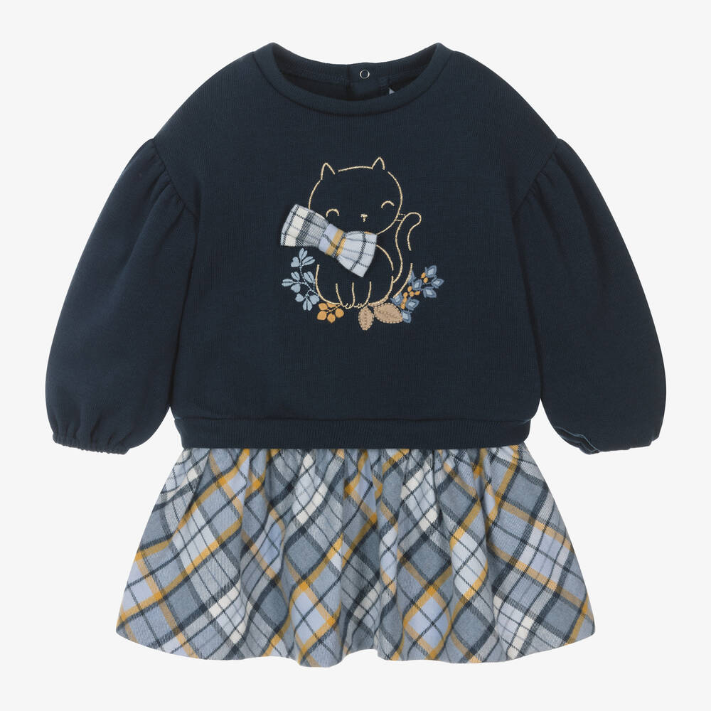 A charming navy blue skirt set for little girls by Mayoral. Made from a soft knit with a fleecy interior, the sweatshirt has a cute embroidered gold cat motif on the front with floral accents and an appliqué bow. Fastening with poppers on the back, it has gathered details and stretchy cuffs. The pale blue check skirt is made from a soft cotton twill and has a concealed side zip and a comfortable adjustable waist.
