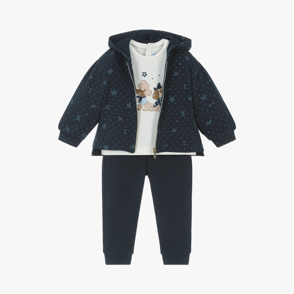 Comfortable for little girls, this navy blue tracksuit set from Mayoral is made in soft cotton jersey. The zip-up hoodie has a contrasting blue floral pattern with glittery gold accents and a gold zip fastening with a branded pull. The cuffed joggers have a stretchy waistband with ruffle trim for a pretty touch. An ivory long-sleeved top completes the set, with an adorable dog motif on the front and easy popper fastenings on the back.