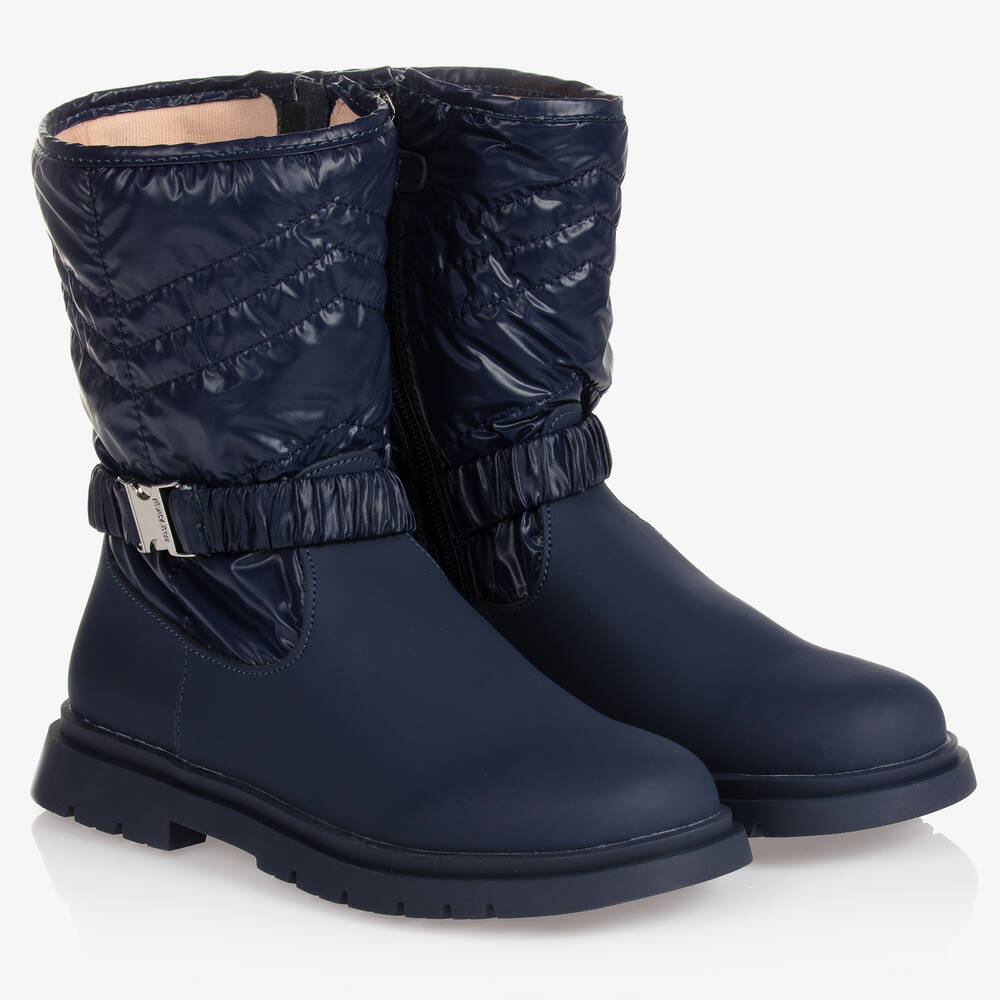 Girls navy blue boots by Mayoral, with water repellent properties for rainy days. The cool uppers have a brushed leather bottom and silky nylon top half. They fasten on one side with a branded zip and velcro, allowing for a secure fit. The textile lining keeps feet comfortable and warmth, whilst the outer sole has deep treads, for added grip.