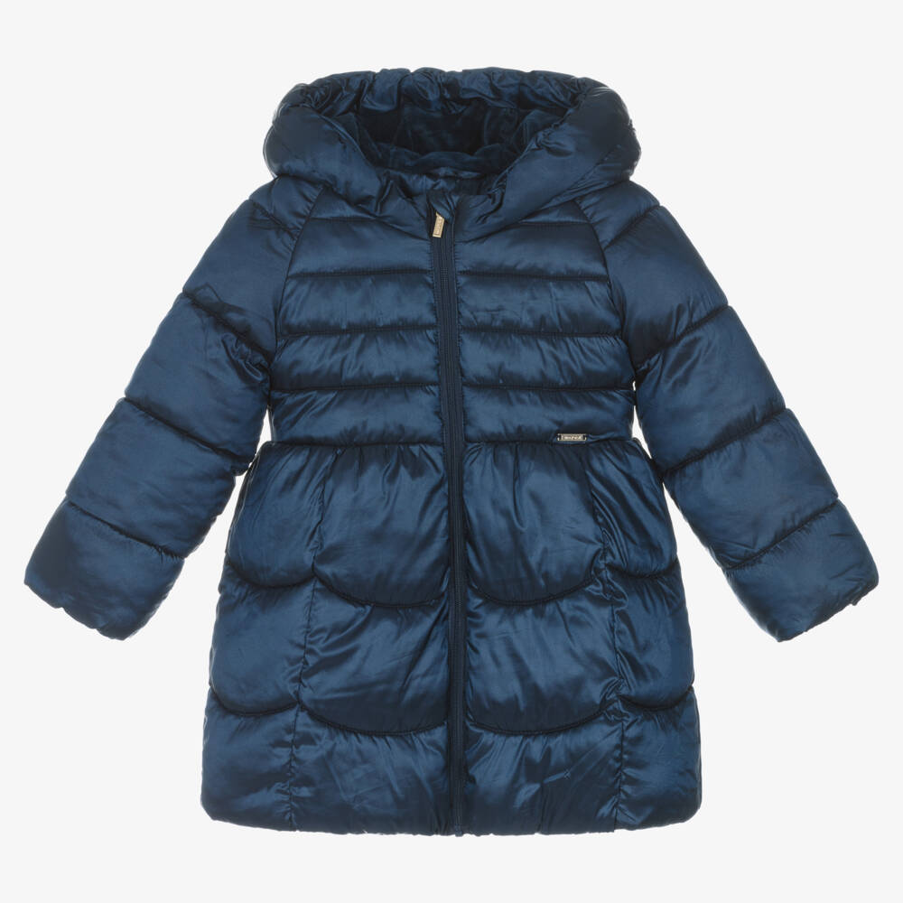 A navy blue puffer coat for little girls by Mayoral, made in a silky smooth fabric with lightweight recycled padding. Great for keeping her warm, this zip-up coat has an elasticated hood and a fleece-lined bodice. There is a metal logo on the front.