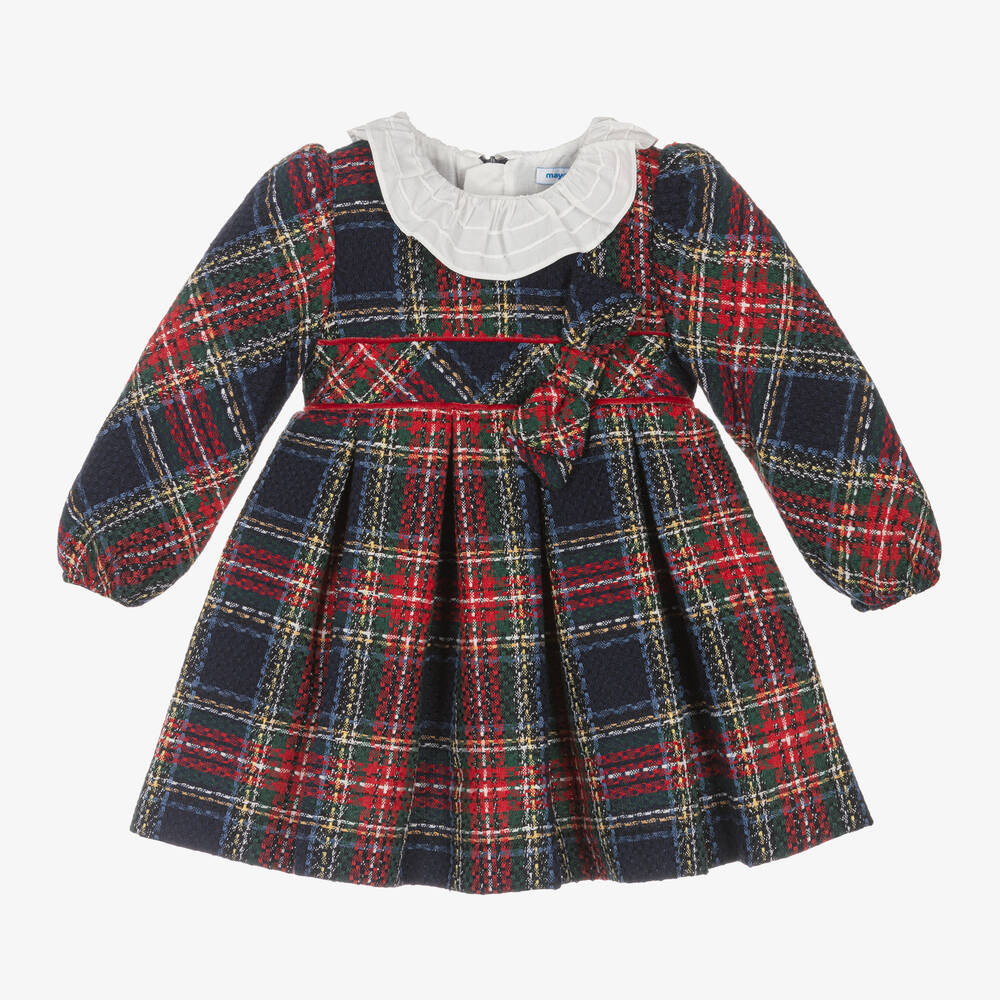 A red and navy blue check dress for little girls by Mayoral, with a lovely sparkly finish. Woven in a soft cotton and wool blend, it is lined with lightweight cotton for added comfort. The waistband has a pretty appliqué bow and red velvet piping for a sweet look. Fastening with a concealed zip on the back, it has a white frilled collar and puffed long sleeves with stretchy cuffs for extra comfort.