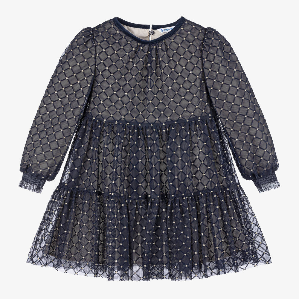 A navy blue dress for girls by Mayoral, lovely for special occasions. This beautiful design is made in soft tulle with a flocked diamond pattern and glittery gold dots. Styled in tiers, it has delicate shirring on the long-sleeved cuffs and a keyhole button fastening on the back for elegance. The full beige lining is made in a cotton blend for comfort.
