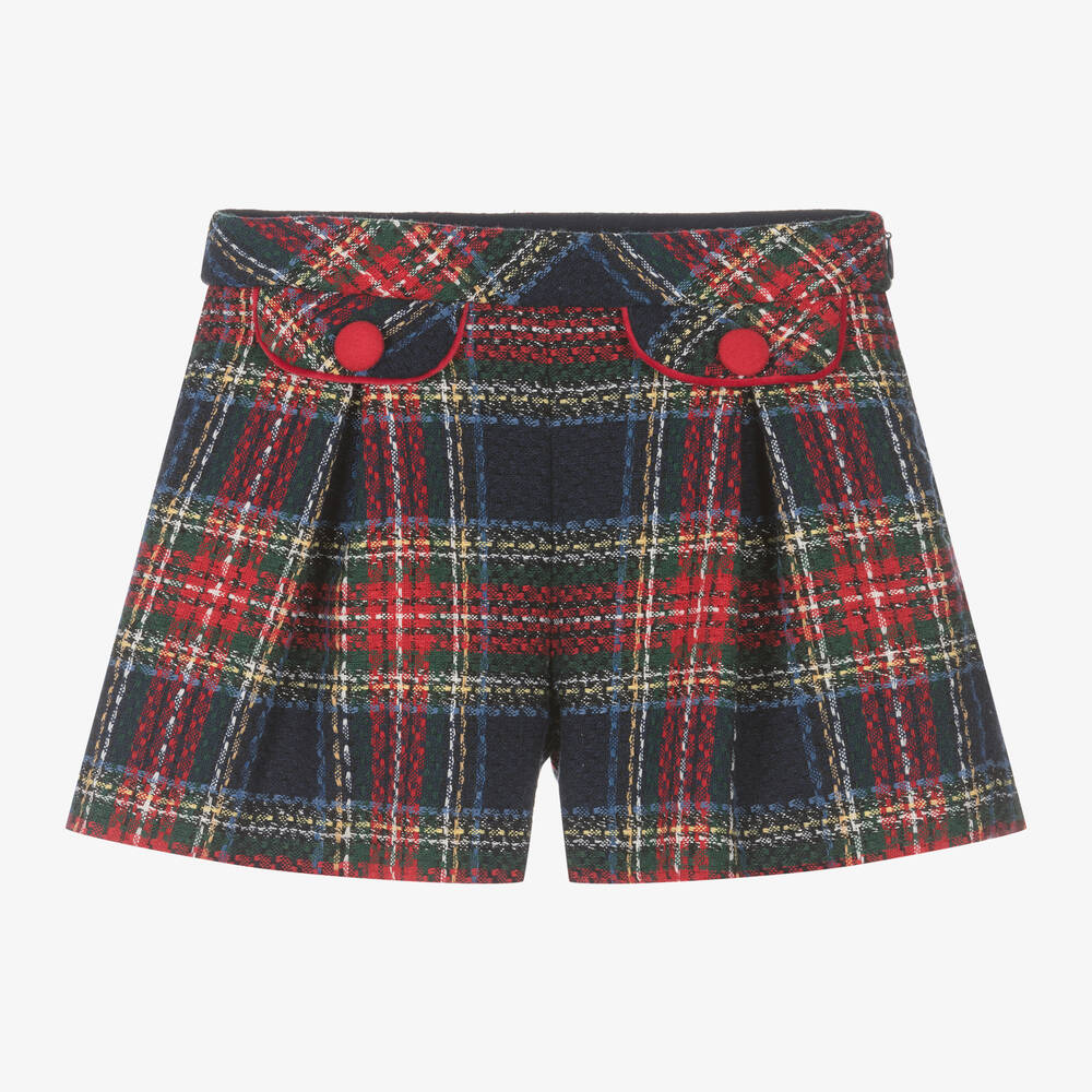 Super-chic tweed shorts for girls by Mayoral, in navy blue, red and dark green tartan. With sparkling silver thread within the weave, they have red velvet faux buttons on the front, pleats for shape, and a concealed zip on the side. These classic shorts are made in a soft blend with cotton and wool. The adjustable waist and cotton lining provide comfort and the best fit.