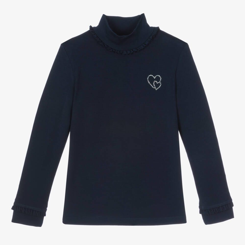 A navy blue roll neck top for girls by Mayoral, made from soft viscose jersey. It has pretty, frilled detailing on the neckline and the cuffs, and a sweet diamanté heart motif on the chest. Lightweight and stretchy, this long-sleeved top slips easy over the head.