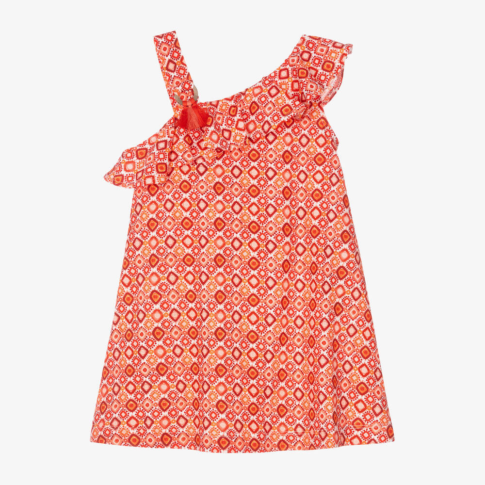 Orange and red cotton dress for girls by Spanish brand Mayoral, with a pretty geometric pattern on a white background. Made in soft, lightweight jersey, it is cool and comfortable, and has an asymmetric frill around the bodice with a fixed, wood-effect ring and tassels on the shoulder strap. Easy to wear, it simply pulls on over the head.