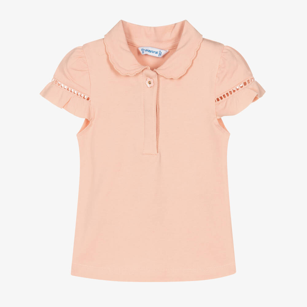 Cute pale pink sustainable cotton polo shirt for little girls by Mayoral. Made in soft, stretchy jersey for comfort, it has a scalloped collar, with stylish cut-work and frills on the puffed sleeves. It has a sweet, flower-shaped button on the front with a shiny gold centre for a girly finishing touch.