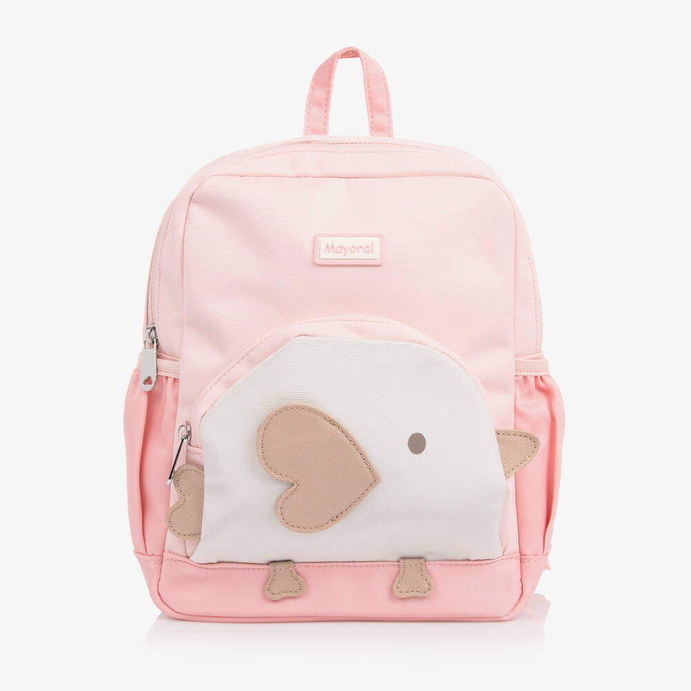 Cute pink backpack for girls from Mayoral. This lovely bag is made of sturdy canvas with two zip-fastening compartments. The shoulder straps are lightly padded and adjustable for comfortable wear. The front pocket is finished with an adorable bird character.