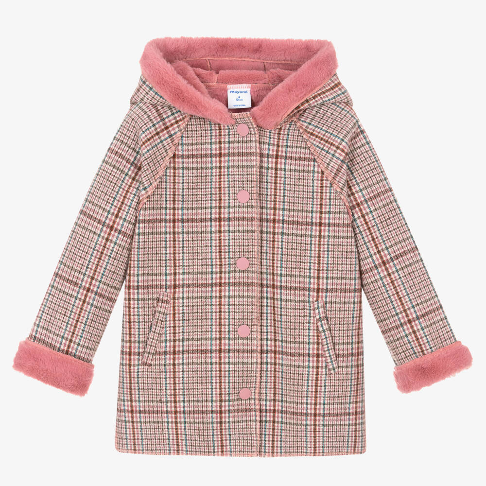 A pink, blue and ivory check coat for girls by Mayoral, in a super soft weave with a faux fur lining. Warm in colder weather, this coat has a cosy hood, front pockets and easy-to-fasten poppers on the front.