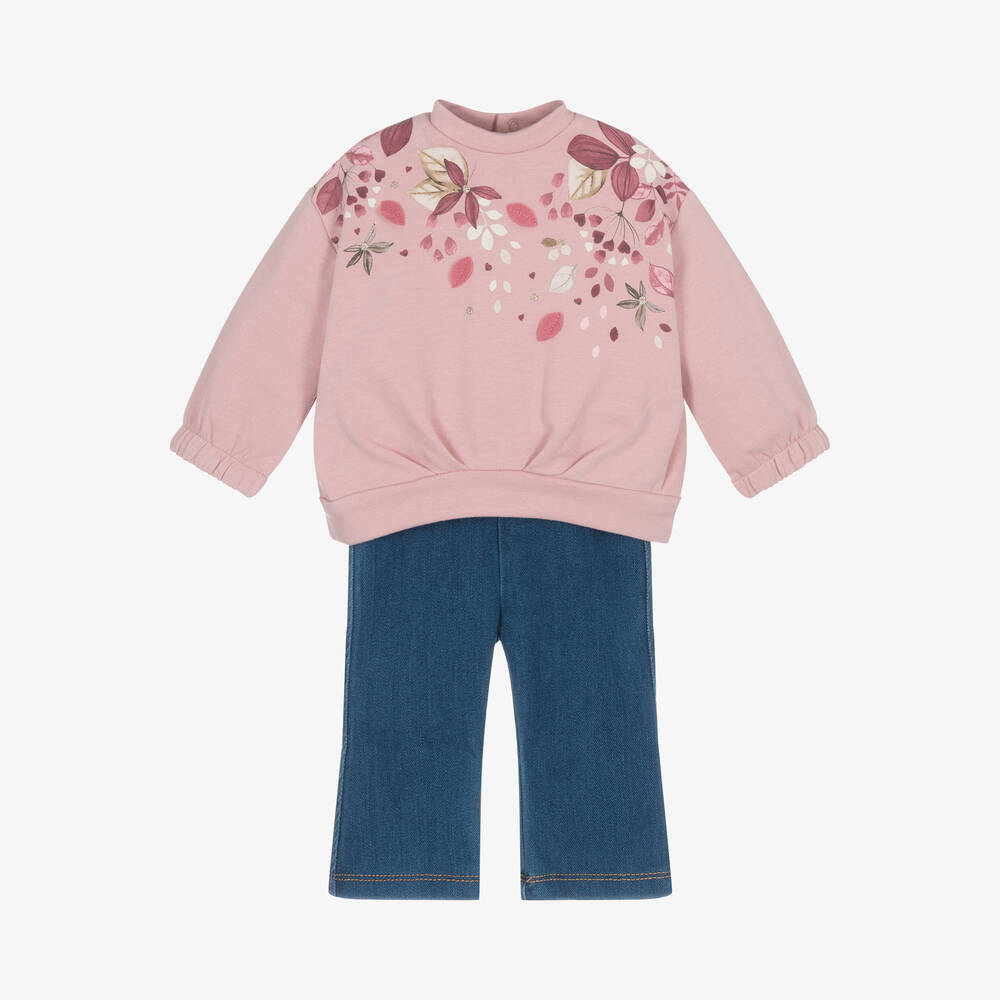 A pink and blue cotton jeggings set for little girls by Mayoral. Made from soft mid-weight jersey with a cosy fleecy interior, the sweatshirt has a pretty pink and beige floral print with appliqué leaves and gold glitter accents. The long sleeves have stretchy cuffs and there is pleated detailing on the front. In the style of bootcut jeans, a pair of jeggings with a comfortable elasticated waist completes the outfit.