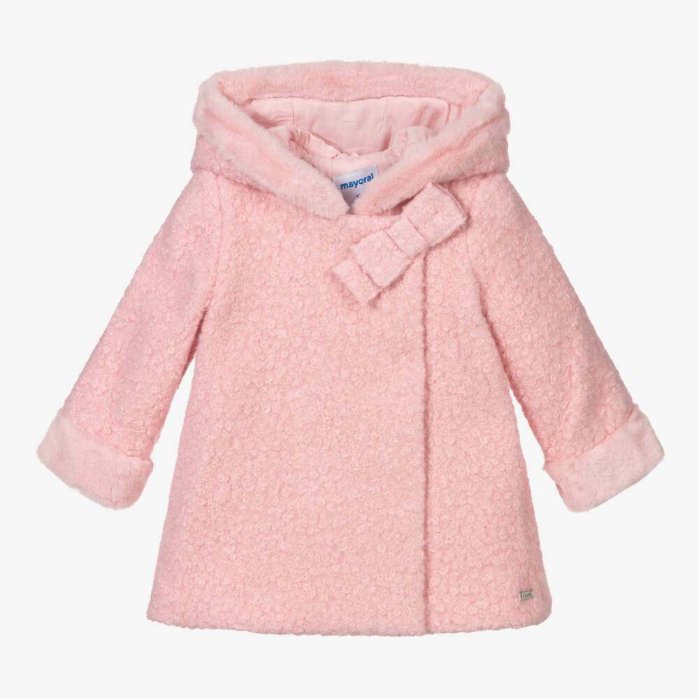 A lovely pale pink bouclé coat for little girls by Mayoral. It has a large bow on the front, with faux fur trim on the hood and cuffs. The coat is lined in lightweight viscose and fastens with large concealed poppers.