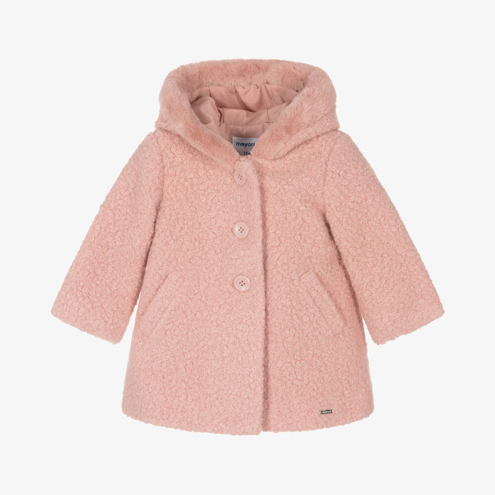Gorgeous pink coat for younger girls by Mayoral, made in beautifully soft bouclé. Lovely for colder days, this cosy coat has a silky lining, slanted front pockets and a fixed hood, trimmed with super soft faux fur for a luxurious feel. Fastening with buttons, it has a small gold logo charm sewn just above the hem and an inverted pleat on the back for a fuller shape.