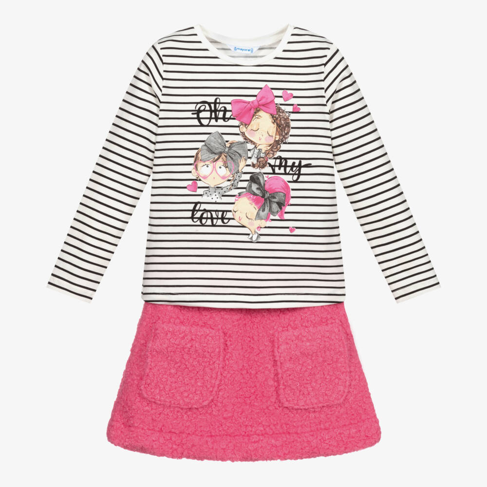 Bright pink skirt by Mayoral, with an ivory and black striped top. The comfortable cotton jersey top has a pink and beige girl print on the front with the words 'Oh my love'. The heavier weight bouclé skirt is fully lined, with pockets on the front and a useful, adjustable waistband.