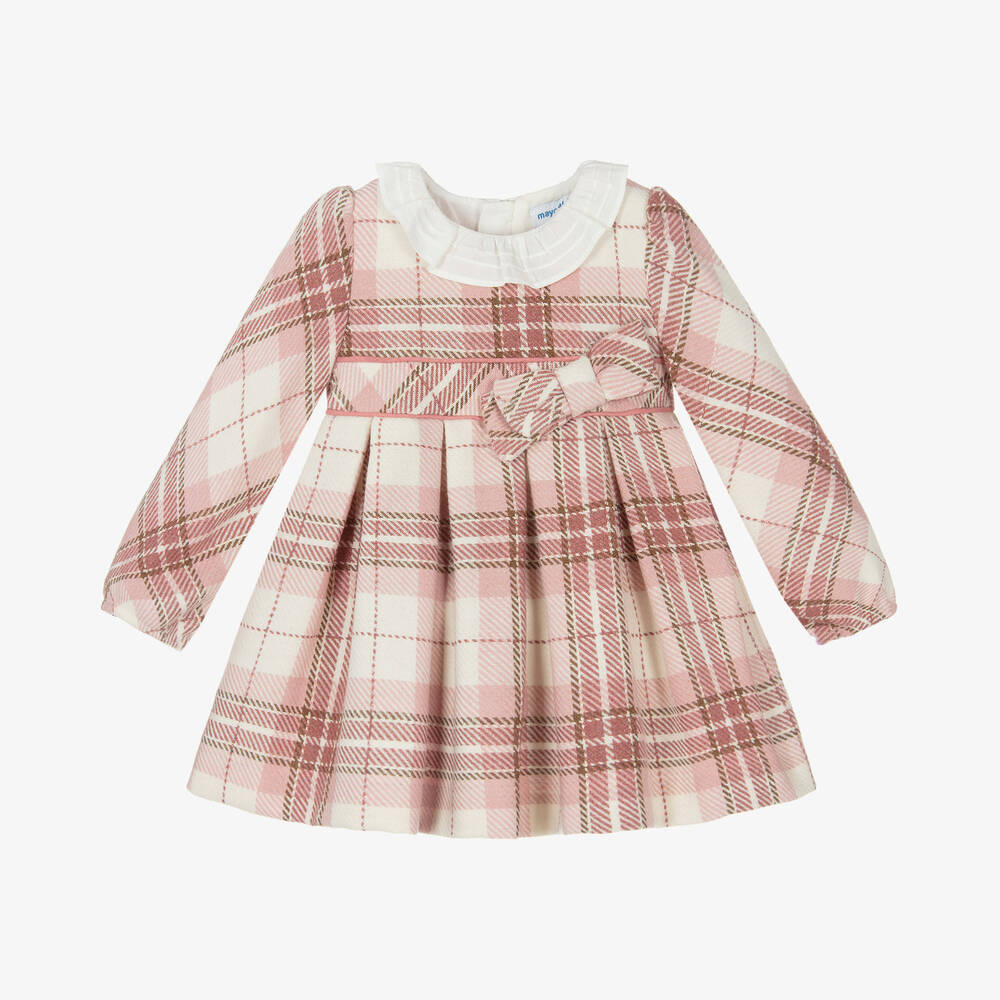 A pink and ivory check dress for little girls by Mayoral. Woven in a soft viscose and wool blend, it is lined with lightweight cotton for added comfort. The waistband has a pretty appliqué bow and pink piping for a sweet look. Fastening with a concealed zip on the back, it has a white frilled collar and puffed long sleeves with stretchy cuffs for extra comfort.