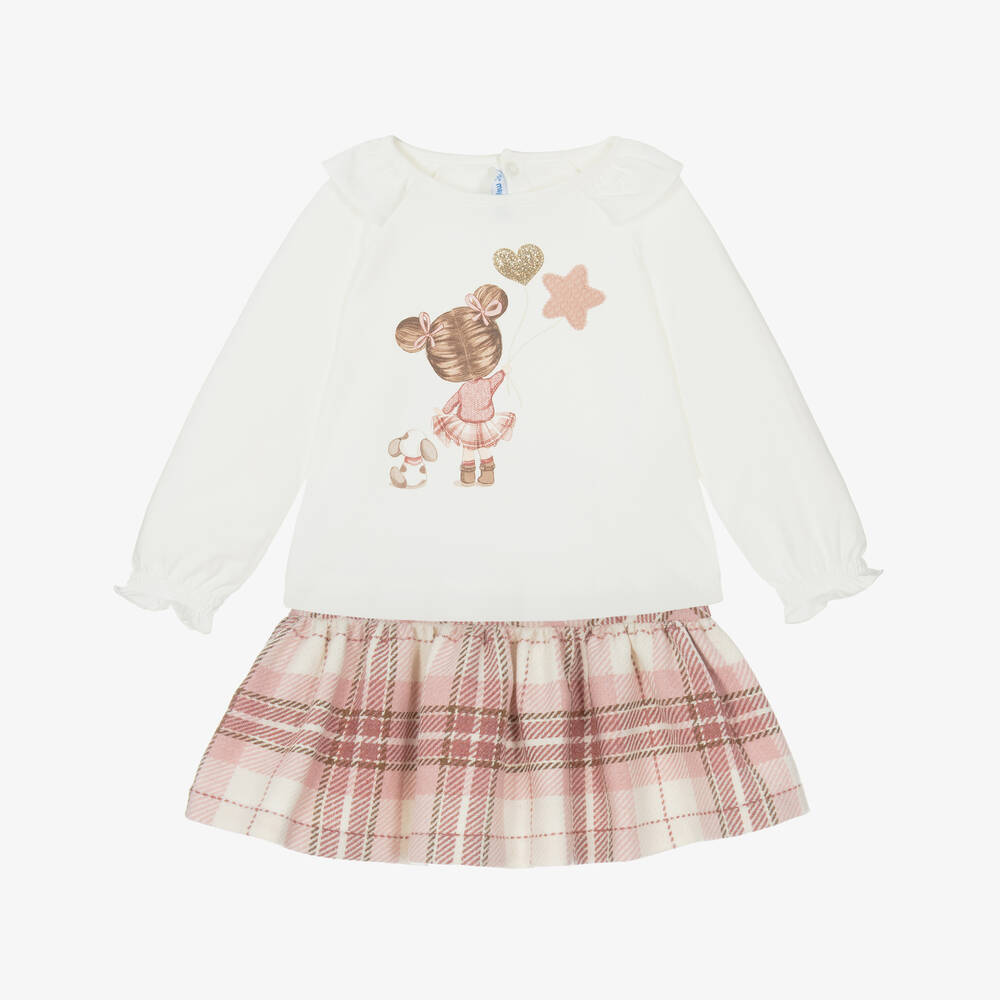 Ivory and pink skirt set for little girls by Mayoral, with a soft and stretchy cotton jersey top. This matching outfit has a cute graphic printed on the front featuring a little girl holding onto her glittery heart-shaped balloon. The top has stretchy, shirred cuffs and concealed poppers on the back. The paired skirt is designed in a beautiful check pattern with a fine lurex thread running through the fabric for a gentle shimmer. It is fully lined with lightweight cotton and fastens with a side zip. The waistband is fully adjustable for a comfortable fit and feel.