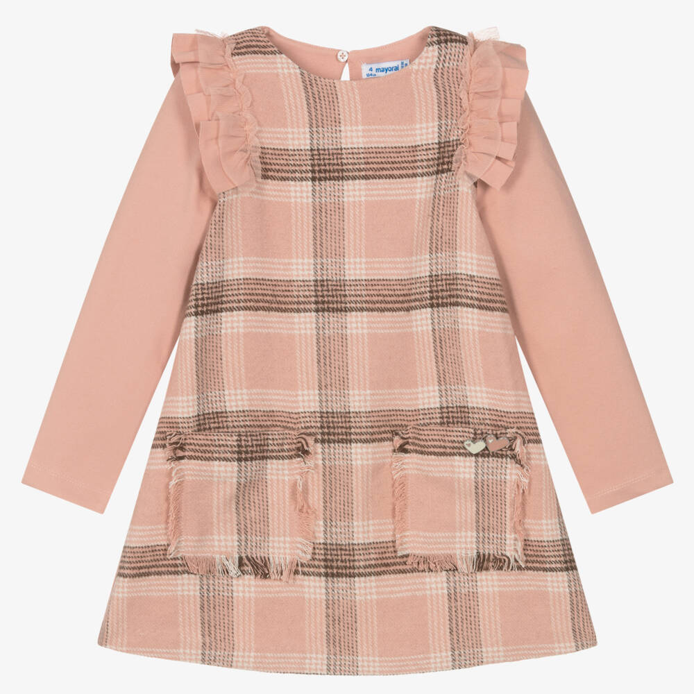 Chic pink Milano jersey dress for girls by Mayoral, with a pink, brown and ivory checked panel on the front. Soft and comfortable, it has a gentle A-line shape and feminine tulle ruffles over the shoulders. The front panel has a lightweight lining and the dress has a keyhole button fastening on the back. For a stylish finish, the front pockets have a fringing trim and there are two enamel heart buttons in ivory and pink.